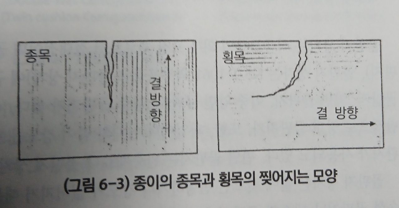 기계방향 - 잘 찟어짐, 판지 구성 섬유의 결방향 - 육안 확인